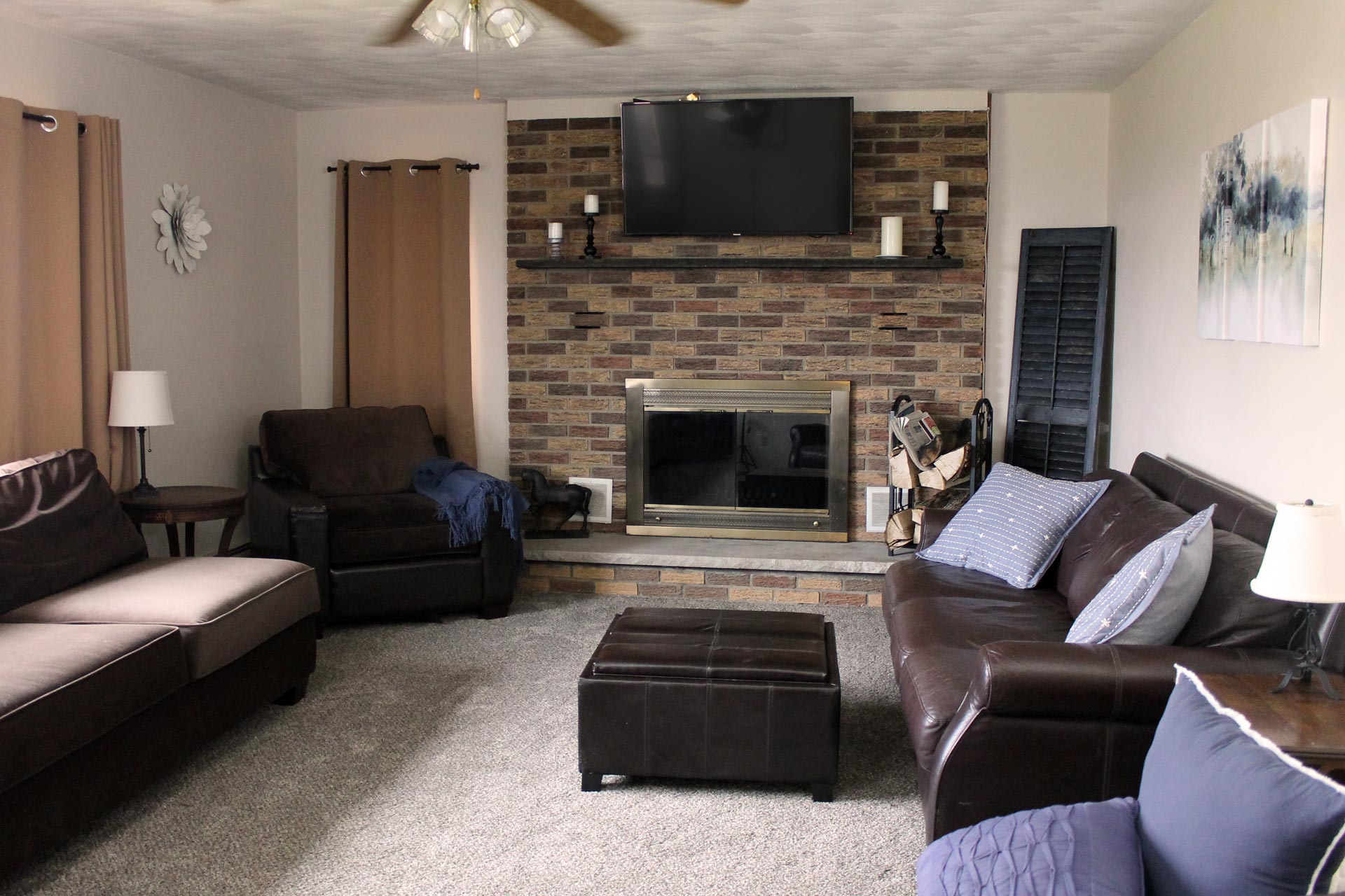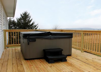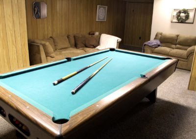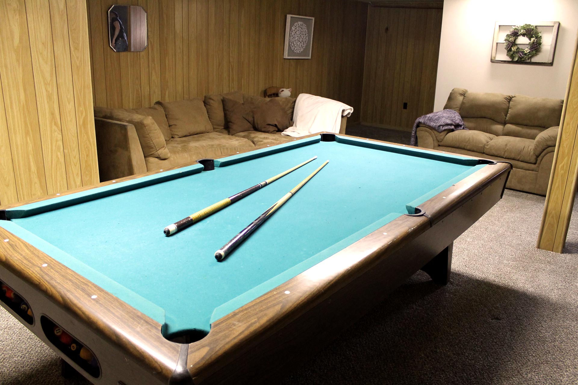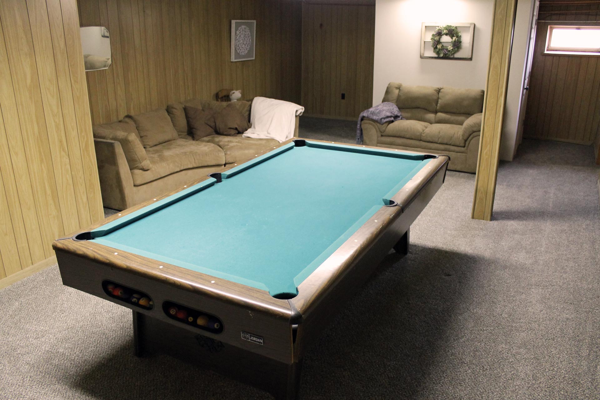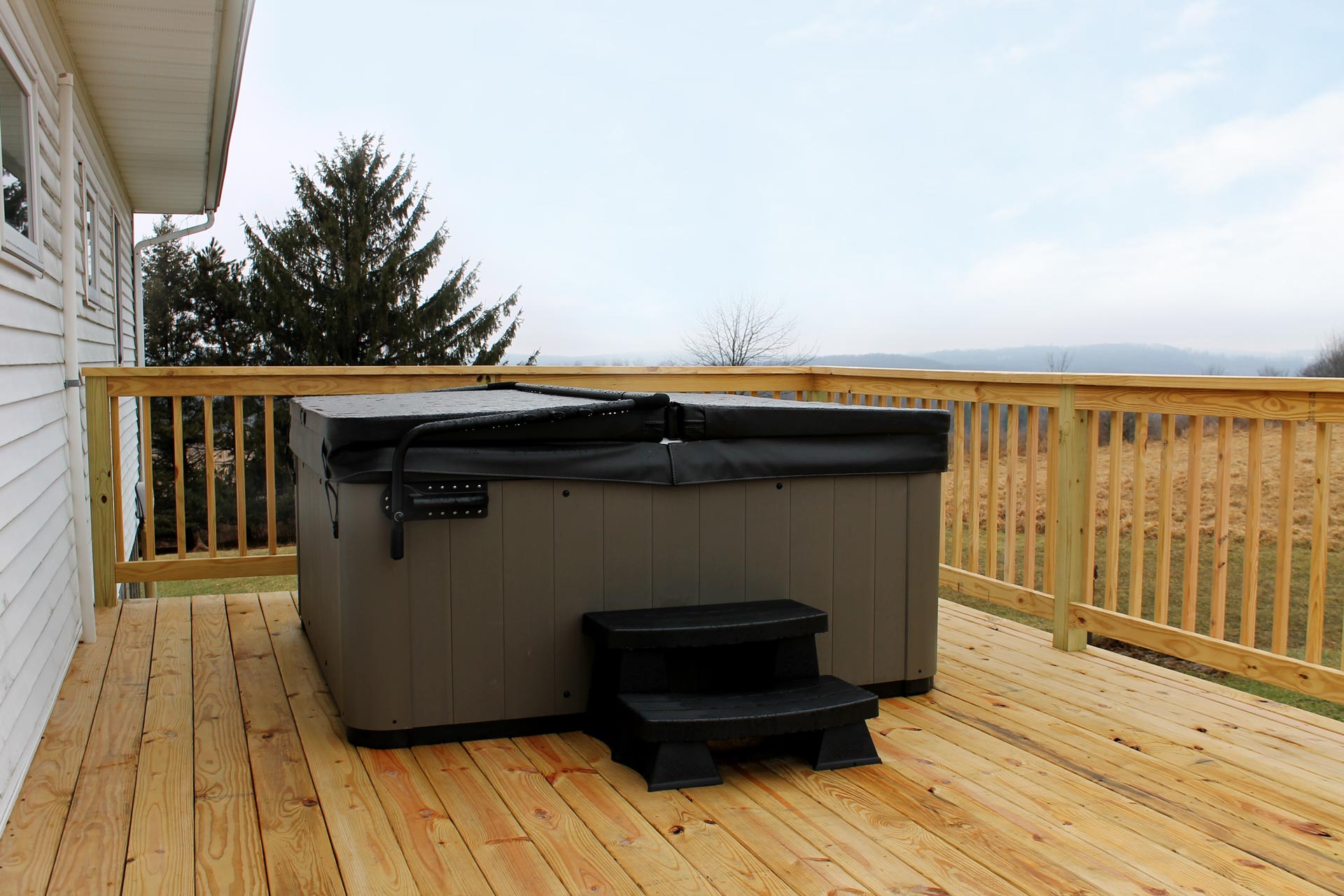 The house includes a wood burning fireplace, hot tub on the back deck, and a finished basement with pool table.